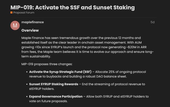 Maple Finance sunsetting SYRUP staking and instead utilising 25% of protocol revenue to be used as buybacks. Suggested this awhile ago given staking yield is just extra supply pressure. Now as Maple continues on it's high growth path we can expect sustainable bids on the