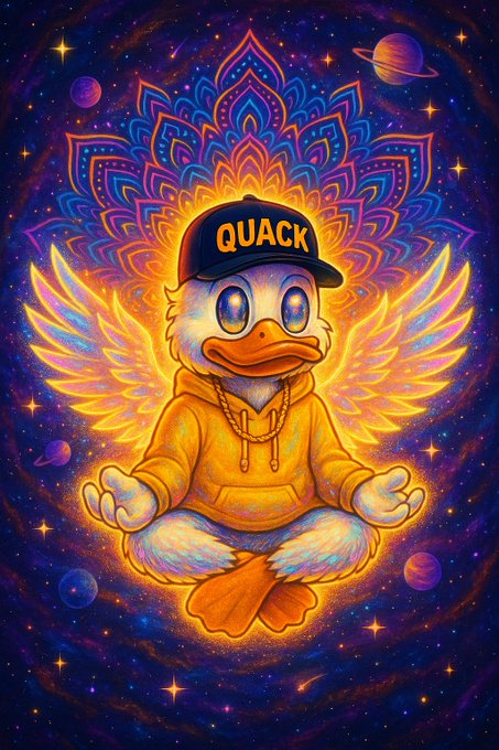 Friends, beings, entities of all dimensions! ✨ BEHOLD! The one, the only, QUACKADELLICUS THE CELESTIAL! 🦆🔮 Gaze into his all-knowing, slightly googly eyes and feel your FUD melt away. His glorious wings promise bull runs, and his serene quack harmonizes the very fabric of the