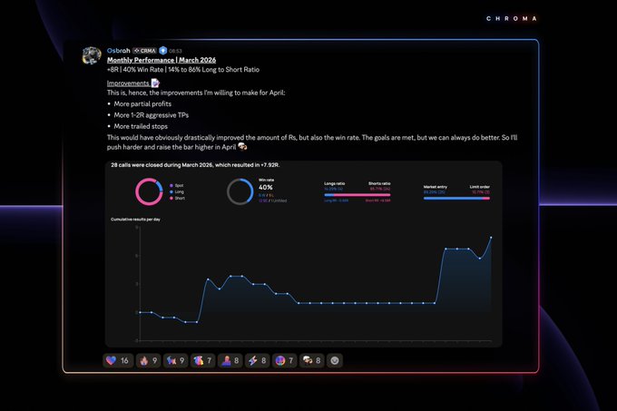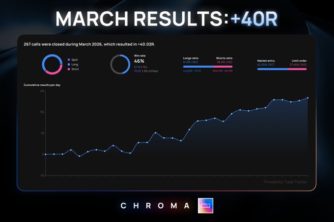 Chroma Team Performance | March 2026 📈 ✅ +40R ✅ 46% wr ✅ 267 trades All setups posted in advance. All wins & losses shared This is real trading, and these are real results Here's to an even bigger April 🥂 #ChromaTrading