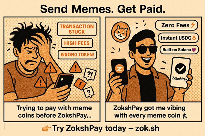 Meme coins deserve better UX. No more failed txns, wrong tokens, or gas fee drama. With ZokshPay, you send ANY Solana meme coin, and your frens receive USDC instantly. Zero fees. Built on Solana. 👇 🔗 http:/zok.sh #Solana #MemeCoin #ZokshPay #CryptoPayments