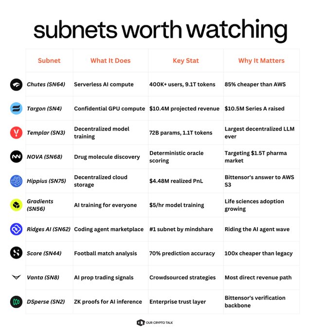 $TAO ripped 75%+ in a month. The Subnets? Moving even harder. 10 Bittensor Subnets worth watching ↓ 1️⃣ Chutes (SN64) - 400,000+ users, 9.1T tokens processed - 85% cheaper than AWS - First-ever $100M Bittensor subnet 2️⃣ Targon (SN4) - $10.4M projected annual revenue - $10.5M Series A raised - Powers Dippy's 4M+ users 3️⃣ Templar (SN3) - Largest decentralized LLM ever trained - 72B params, 1.1T tokens, zero clusters - Jensen Huang publicly acknowledged it 4️⃣ NOVA (SN68) - Decentralized drug molecule discovery - Targeting $1.5T pharma industry - Deterministic oracle scores every output 5️⃣ Hippius (SN75) - Bittensor's answer to AWS S3 - $4.48M realized PnL - Blockchain-backed persistent storage 6️⃣ Gradients (SN56) - Train AI models for $5/hour - Life sciences sector adopting it - Part of Rayon Labs' dominant trio 7️⃣ Ridges AI (SN62) - Autonomous coding agent marketplace - Highest mindshare of any subnet - Riding the AI agent wave 8️⃣ Score (SN44) - AI football analysis, 70% accuracy - 100x cheaper than traditional methods - $600B soccer industry target 9️⃣ Vanta (SN8) - AI-generated prop trading signals - Crowdsourced strategy competition model - Most direct path to revenue 🔟 DSperse (SN2) - Zero-knowledge proofs for AI inference - Enterprise trust infrastructure layer - Bittensor's verification backbone
