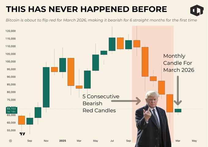 Trump just gave Iran 48 hours to open Hormuz. If Iran doesn’t comply 👀 → Oil spikes harder → Inflation surges → Markets go full risk-off. → March become BEARISH That’s a direct trigger for Bitcoin’s rarest bearish setup to fully load. Bitcoin has already closed 5 consecutive red monthly candles. March is the 6th… and right now it’s bleeding. We already saw the first reaction: BTC lost $69.2K instantly after the escalation. This is not random. This is macro pressure forcing the final red candle. 👉 WHY THIS MATTERS This setup has almost NEVER happened. And it only completes under extreme conditions: War fears, liquidity drain and forced selling. Exactly what we’re seeing right now. The Strait of Hormuz controls ~20% of global oil supply. If this escalates, inflation spikes again. And Bitcoin gets pushed down one last time. 👉 THE REAL MEANING If Iran doesn’t follow the 48h deadline… That 6th red candle will print. Not because BTC is weak. But because the world is breaking around it. And historically… That’s exactly when the bottom forms.