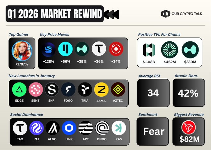 Q1 2026 Market Rewind ⏪ Key Price Moves 📈 $RIVER +128% $QUBIC +66% $HYPE +39% $TAO +36% $RENDER +34% > AI Altcoins are leading the moves. Social Dominance 📱 • TAO • INJ • ALGO • LINK • APT • ONDO • KAS Biggest TVL Growth : @provenancefdn + $1.08B @Mantle_Official + $462M @HyperliquidX + $280M New Launches 💎 - @edgeX_exchange - @SentientAGI - @solanamobile - @fogo - @useTria - @zama - @aztecnetwork > Bitcoin suffers its worst Q1 since 2018 > SEC drops dozens of enforcement cases against crypto firms > Kraken secures the first-ever Federal Reserve master account > SEC classifies major Altcoins as digital commodities > Mastercard buys stablecoin payments giant BVNK for $1.8B > Strategy scoops up 90K BTC > Fear and Greed index reaches record lows > Bitcoin dominance still over 50% Q1 is ending in red but also with a hope of a better Q2 What's your biggest prediction for Q2 2026?