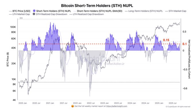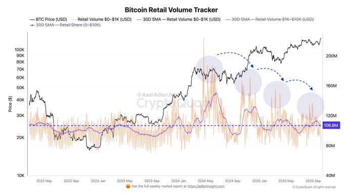 Since spring 2024, a steady downward trend in amplitude has been visible in the small transaction segment (up to $1K). Each new spike in retail participation is lower than the previous one, while the price is making higher highs.