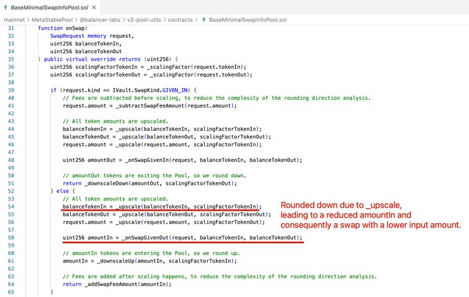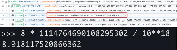 .@Balancer announced that it successfully executed a rescue of ~$4.1M following a new exploit path. Although detailed information has not yet been disclosed, our initial analysis indicates that the root cause may stem from a rounding-down issue in the known _upscale function. Notably, unlike the previous attack, this exploit path involves only two tokens (e.g., rETH/WETH). The exploit itself is quite sophisticated, leveraging carefully crafted amounts to manipulate precision loss and ultimately generate profit. twitter.com/Phalcon_xyz/status...