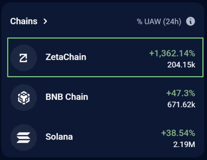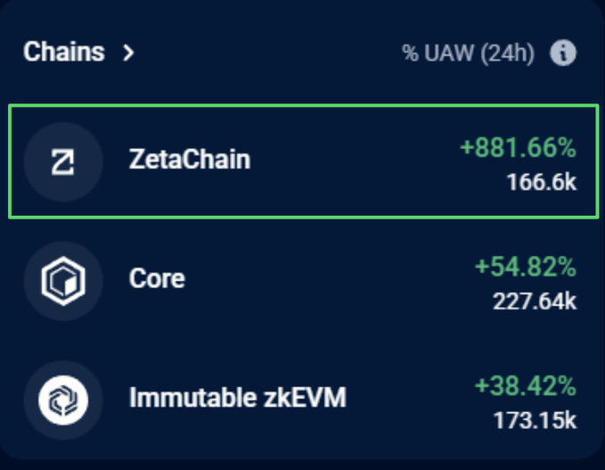 ZETACHAIN IS THE FASTEST-GROWING BLOCKCHAIN 📈 Up +881% in the last 24h @DappRadar 🟩 Now a Top 10 L1 by weekly active users The Universal Blockchain is just getting started.