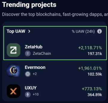 ZetaChain trending today on @DappRadar! 📈 #1 L1 growth — up +1,362% in active wallets (alongside @BNBCHAIN & @solana) 🚀 #1 App is ZetaHub — up +2,118% in users Access all of crypto, everywhere — on the Universal Blockchain.