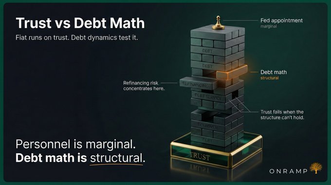 Lots of chatter about the next Fed Chair. Respectfully, it barely matters. $38 trillion in debt. Refinancing wall approaching. Debt service costs compounding. These are math problems, not personnel problems. Personnel is marginal. Debt math is structural.