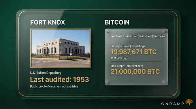Fort Knox: last audited 1953. No public proof of reserves. Bitcoin: 19,987,671 BTC in circulation. Verifiable by anyone, anytime, on-chain. One asks for trust. The other doesn't have to.