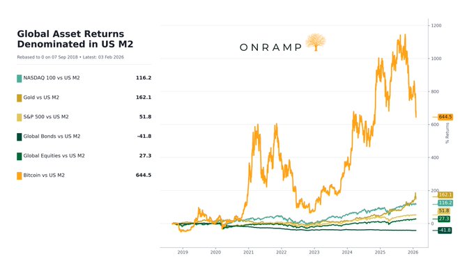 Denominate asset returns in M2 and most portfolios are treading water or going backwards. Global bonds down 41%. Global equities up just 27%. Bitcoin up 644%. Nominal returns are a mirage.