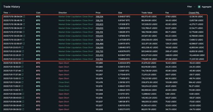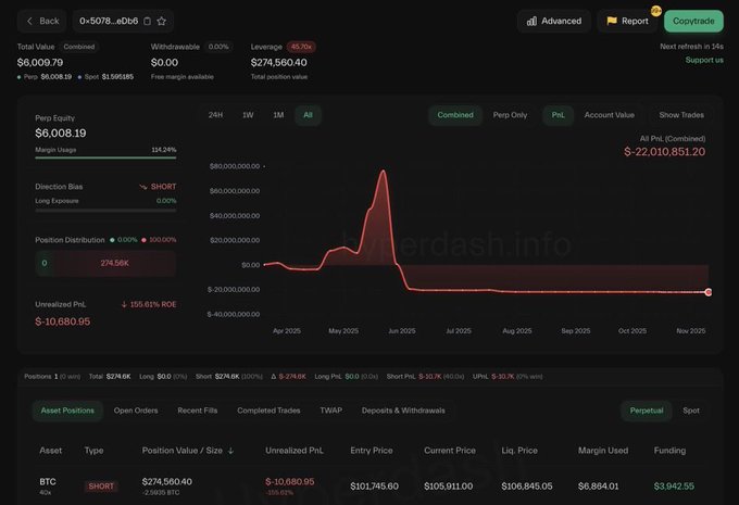 JUST IN: James Wynn hit with 12 more liquidations in 12 hours as market rebounds. After 45 losses in two months, one winning trade wasn’t enough—he kept adding and lost again. His balance is now $6,010. Total PnL: -$22,010,851.20