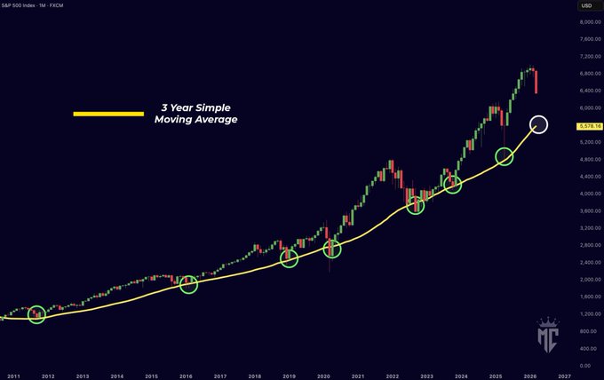The S&P 500 ALWAYS bottoms around the 3-year SMA. That level sits at $5,580 right now. If the stock market falls that much, it will drag crypto down with it. Patience is key here.