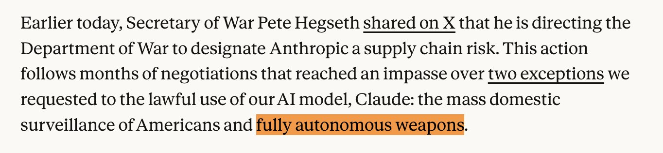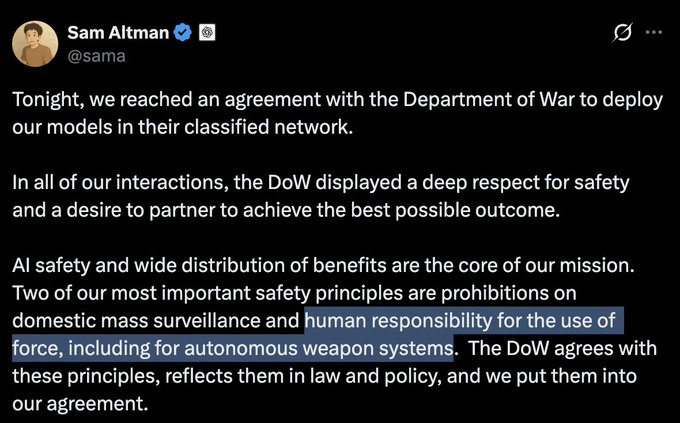 One of the exclusions to the use of AI is subtly different between OpenAI and Anthropic's communications. Sam: "human responsibility for the use of force, including for autonomous weapon systems." Anthropic's PR just says "fully autonomous weapons." twitter.com/_weidai/status/202...