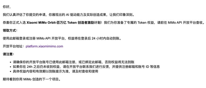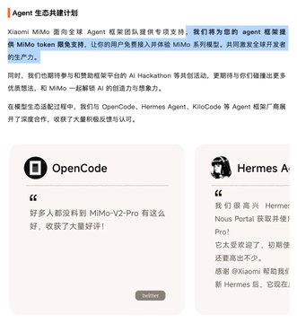 Agent Ecosystem Co-construction Program: This program will provide limited-time free MiMo token support for your agent framework, allowing your users to access and experience the MiMo series models for free.