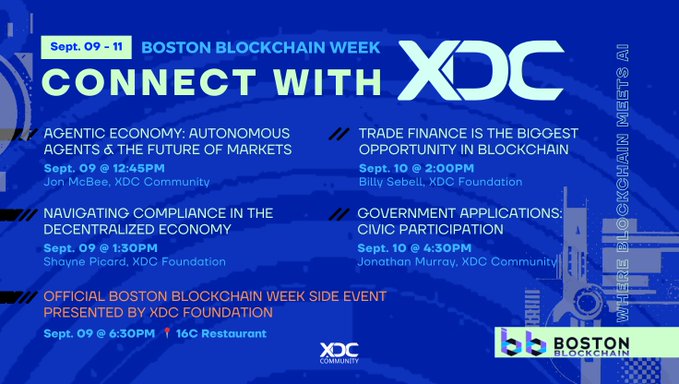 XDC will be showing up at @blockchainwk 2025! 📍 September 9–11 at Kilroy Square in Quincy, MA If you're in the Boston area, come connect with local @XDC_Network_ community and @XDCFoundation members to discuss two world-shifting technologies, blockchain and AI!