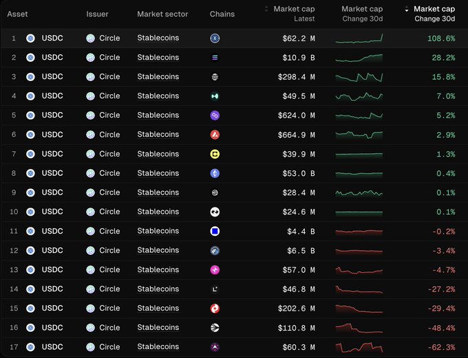 The fastest growing $USDC deployment, based on 30d change (%) in market cap: USDC on @XDCNetwork, w/ market cap up +108.6% in the past month.