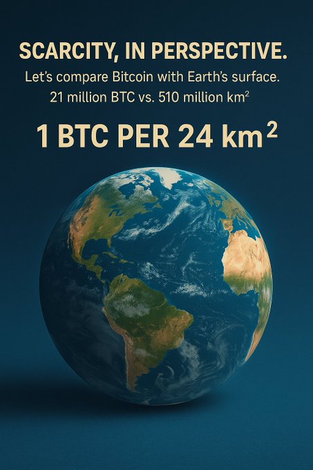 📏 Visualizing Scarcity: What Does 21 Million Actually Mean? Bitcoin’s fixed supply of 21 million is often discussed in abstract terms. Let’s bring it back down to Earth, literally. 🌍 Earth’s total surface area: 510 million km². Now imagine this surface represents 21,000,000