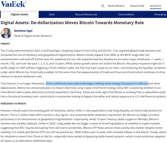 💥 The US dollar is being replaced by Bitcoin VanEck reports loud and clear: China and Russia are now settling some transactions in Bitcoin. Two global powers are no longer relying on the US dollar, the world’s reserve currency of the last century. Instead, they’re turning to