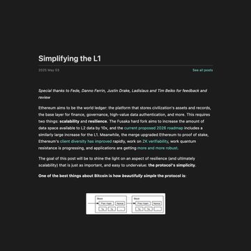 ⚡️NEW: Vitalik Buterin has released the “Simplifying the L1” proposal, outlining a five-year plan to streamline Ethereum with a 10× L2 data boost. It also proposes a max code-line cap to align Ethereum’s core with Bitcoin’s simplicity and resilience.