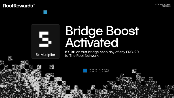 Bridge Boost Activated! 🚀 For a limited time, earn 5x RP for bridging any ERC-20 token to The Root Network. Strengthen the network and unlock more rewards. #RootRewards