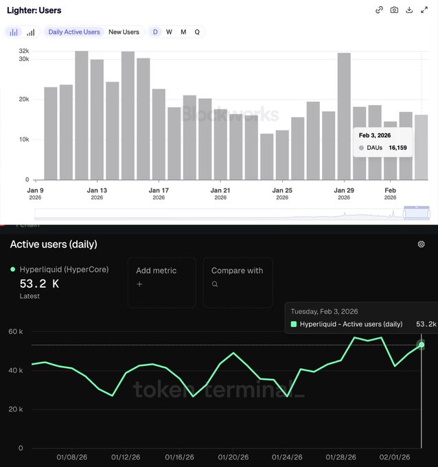 Some takeaways from the new blockworks Lighter dashboard: 1) Hyperliquid has 3.3x the DAUs of Lighter
