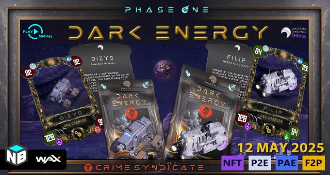 ⚠️DARK ENERGY DROP⚠️@WAX_io The 2 strongest machines in MMHe3. Only 10 of each will ever exist. 🛠️OIZYS Dark Energy Drops tomorrow in-game shop Price: 200,000 He3 🔥FILIP Dark Energy May 12, 20:15 UTC on NeftyBlocks Price: 999 WAX neftyblocks.com/collection/moo...… Miss it = miss forever.