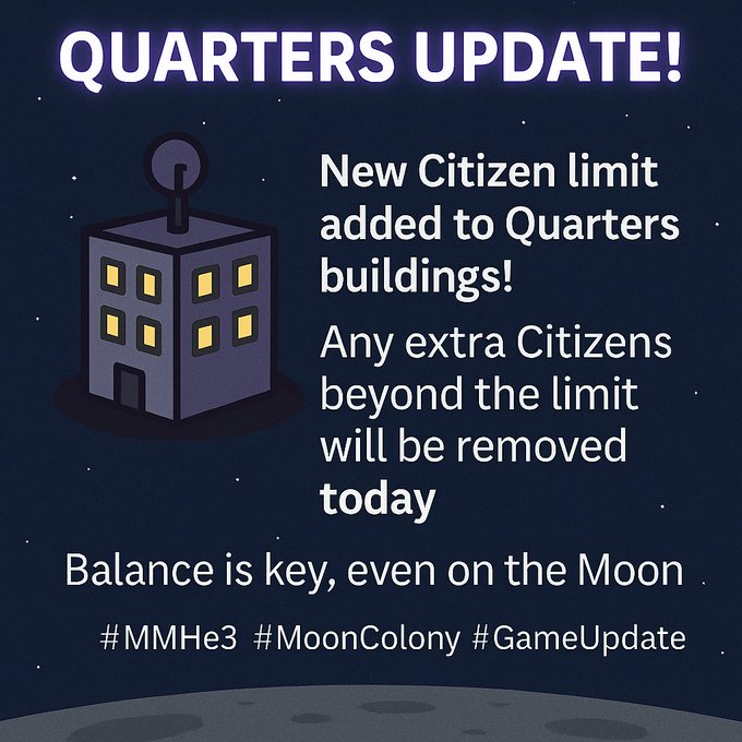 🛰️ Quarters Update! @WAX_io New Citizen limit added to Quarters buildings! 🌙 Any extra Citizens beyond the limit will be removed today. Balance is key, even on the Moon 🌌 #MMHe3 #MoonColony #GameUpdate