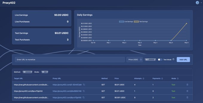Yesterday @coinbase announced x402 We built http:/proxy402.com the easiest way for anyone to try the latest open protocol for payments over the internet 🎉 With Proxy402 you can wrap any link with x402. Just set the link and price and you are good to go 🚀