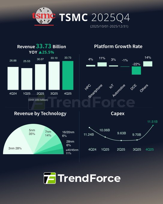 TSMC released its 4Q25 earnings on the 15th, reporting consolidated revenue of $33.83B for the quarter. Gross margin came in at 62.3%, exceeding the high end of the companyās prior guidance. Looking ahead to 2026, TSMC struck an upbeat tone, forecasting first-quarter revenue of $34.8ā35.8Bāpoised to challenge a new quarterly recordāand announcing a significant increase in capital expenditures to $52ā56B to support growing demand for advanced process nodes.
