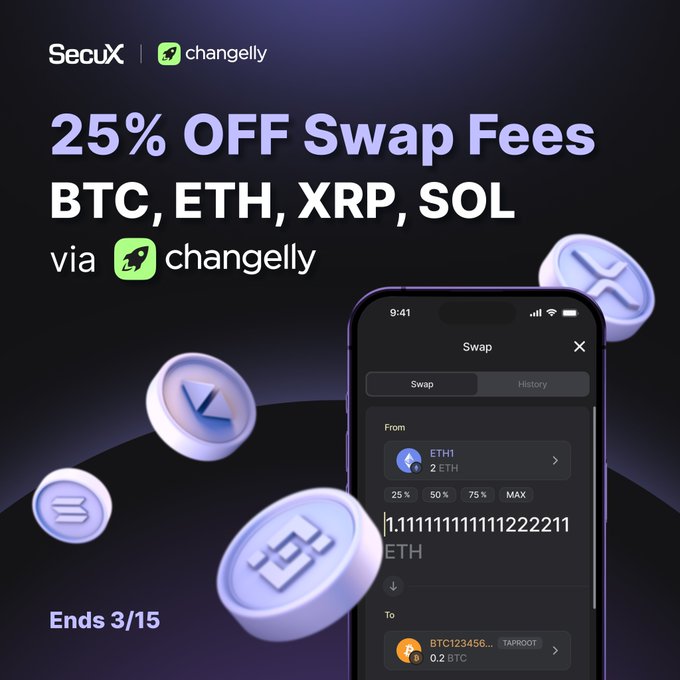 🚀 Get 25% off swap fees when swapping BTC • ETH • XRP • SOL via @Changelly_team inside SecuX Wallet App & SecuXess ⏳ Ends 3/15 Swap now 👇 lihi.cc/QjFAn