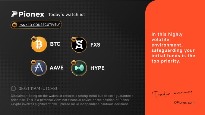 📅 5/21 Watchlist 🏯 $BTC, $FXS, $AAVE, $HYPE on our radar today! 💡Friendly Reminder: The selected coins aren't guaranteed to rise — they just show stronger upward momentum and lower downside risk #BTC #FXS #AAVE #HYPE #Pionex
