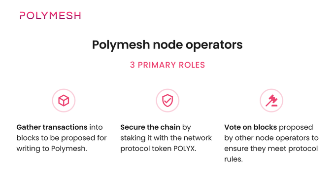 Polymesh node operators play a critical role in the network. They propose blocks, secure the chain through staking, and validate activity according to protocol rules. Visit http:/polymesh.network/node-op... to learn more.