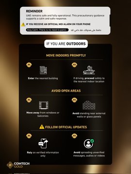 ComTech Gold stands with the community in promoting calm, responsibility, and informed action. The UAE continues to remain safe and fully operational — and staying composed, following official guidance, and relying only on verified information is key.