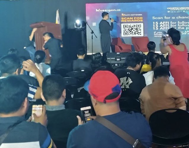 Eventgoers scanning for crypto rewards at Crypto Vision Conference Philippines 2025. Check out our first use-case of reward distribution at IRL events. You can see the user wearing a red cap with Affi Widget on his screen. He can simply complete tasks and claim rewards