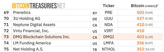 Since our 15 July 2025 update on BTC Treasuries, DMG has move to 73rd from 50th place. Despite a major influx of new treasury companies, DMG's hodl has been fairly consistent.