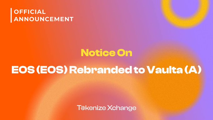 📢Important Update📢 Starting May 23rd, Tokenize Xchange will facilitate the rebranding of EOS Token to Vaulta (A). Please note that trading pairs, deposit and withdrawal functions for EOS will be suspended. For a seamless trading experience, please review the complete details