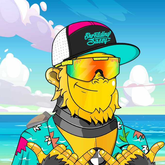 Mountains, gondolas, chalets, goggles with Sassy behind the lens. Flag pins rep where you ride from — UK and US crew.