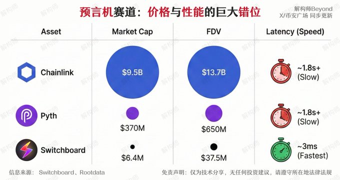 While reviewing data from the oracle sector recently, I discovered a very perplexing phenomenon: a stark misalignment between asset prices and product performance. I'm unsure if the market hasn't caught up yet, or if it's still clinging to outdated valuation logic. The current market capitalization hierarchy looks like this: - Chainlink $LINK Market Cap 9.5 billion / FDV 13.7 billion - Pyth $PYTH Market Cap 370 million / FDV 650 million - Switchboard $SWTCH Market Cap 6.4 million / FDV 37.5 million Switchboard's market cap is less than 2% of Pyth's. This valuation gap usually indicates a significant technological or ecosystem lag, but after analyzing the actual business data, the situation is quite the opposite. 1/ Actual Testing of Latency and Block Rate In DeFi, especially on high-frequency chains like Solana, speed is not just about the user experience, but also the foundation of risk control. - Pyth's on-chain latency is approximately 1.8 seconds. Without paying priority fees, there's about a 30% probability of failing to be added to the chain on time. - Switchboard boasts a latency of only 3-4 milliseconds. Thanks to its TEE architecture and Surge model, it has a 95% probability of completing block writing in the next slot, even without paying priority fees. 2/ Differences in Architectural Patterns: Most oracles on the market, including Chainlink and Pyth, still rely on consensus propagation or are primarily permissioned, which limits scalability to some extent. Switchboard follows the TEE (Trusted Execution Environment) approach, making it the only oracle currently capable of achieving millisecond-level latency with "permissionlessness." Its newly launched on-chain subscription model allows anyone to directly subscribe to data streams with token payments, without sales intervention or API approval. This is the form that Web3 infrastructure should possess. 3/ Business Capacity: Although its market capitalization is only over 6 million, it already covers leading protocols such as Jito, Drift, and Kamino, protecting over $5 billion in on-chain value. / On one hand, there's a mainstream target with a market capitalization of 370 million but a latency of 1.8 seconds; on the other hand, there's a target with a market capitalization of 6.4 million but a latency of only 3... Millisecond-level technology targets This inversion between fundamentals and market capitalization is extremely rare This may mean that pricing power in the oracle sector is currently still in the hands of brand inertia rather than technology and efficiency. However, if the market eventually returns to rationality, this asymmetry itself is worth noting. @switchboardxyz @hermidao1