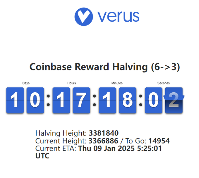 The verus halving is getting closer folks. Instead of 8640 $VRSC of daily coinbase reward, only 4320 $VRSC/day are added to the circulating amount, starting from January 9th. This brings yearly inflation down to only 2%. 🔥💙✌️ twitter.com/joefromthehills/st...