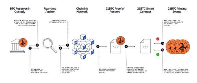 Chainlink Proof of Reserve Secure Mint powers real-time reserve monitoring and secures the minting of @21co__’s wrapped Bitcoin product, 21BTC, on Solana and Ethereum. Secure Mint enables token developers to programmatically require reserves to be greater than or equal to the