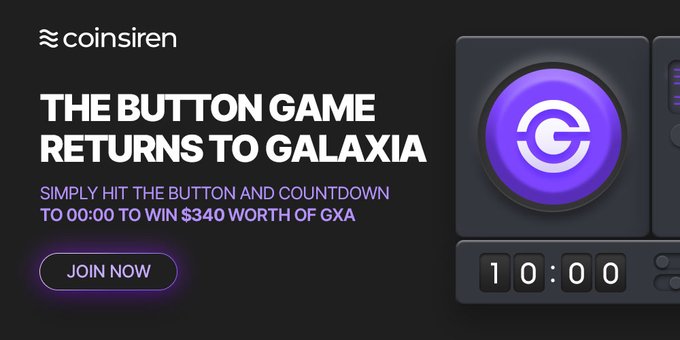🚨 Win a #GXA Welcome to #Button, a game that opens the door for you to win 1 🔸 5 chance to click the button 📌 Watch an ad to click again 🔸 When the timer runs out after 10 min, it's game over 🔸 Last person to click the button, wins Play now➡️coinsiren.io/arcade/button