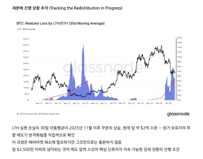 8.4 Million Bitcoins Currently at a Loss Looking at this week's on-chain data, the current market structure bears a striking resemblance to the situation just before the massive crash in 2022. Those who bought between $80k and $126k are all currently experiencing losses, and I suspect the short-term direction will be determined by the choices they make going forward. If they sell -> Selling pressure with every rebound If they hold -> Gradually digesting over time Neither is an easy choice. In terms of numbers: Bitcoins at a loss: Approximately 8.4 million Daily stop-loss volume by long-term holders: $200 million Bottom signal baseline: Cooling below $25 million per day We are still a long way from that baseline. It is an ongoing process, not the end. ----- There are some hopeful signs, though. Spot buying on Coinbase has quietly turned positive. This means that someone has started picking up shares in a market that was only selling throughout January and February. Dealers' gamma positions have also returned to supportive territory. It is a small change, but the structure is shifting little by little. However, there is one zone we need to be careful about. If it drops below $68k, dealers will be structurally forced to sell -> hedging volumes will flood in, potentially leading to a retest of $60k. Realized volatility is 38%, implied volatility is 49%. The 11-point difference tells us one thing: The market appears quiet, but participants are still afraid of a decline. This is a zone where even a small shock can cause significant turmoil. In conclusion, I believe we are currently in a redistribution phase, neither a rebound nor a collapse. (The process of volume purchased above $80k passing into new hands.) Two signals that this is being completed: 1. LTH stop-losses cooling to below $25 million per day. 2. Spot buying pressure continuously expanding. Until both are confirmed, I think it would be more reasonable to observe or split buy rather than taking overly aggressive positions.
