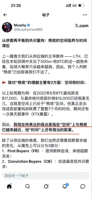 This is hands down the most badass prediction I've ever seen in the English crypto community! Back in May 2025, he predicted the entire bull-bear cycle structure and trend for this run—and the way things have played out is almost a carbon copy of his forecast. Absolutely legendary, way beyond my own level. Sure, I also calculated early on that $120k+ would be a reasonable top for this cycle, and I managed to sell near the peak. But I definitely didn’t have the clairvoyance to foresee a 50% BTC retrace and nail all the key consolidation levels in advance. In the quoted tweet, Killa shares some views that are pretty similar to what I’ve been posting lately, like: I think BTC is already very close to the cycle bottom in terms of price, just not quite there yet in terms of time. Killa reckons we might see another 10-15% downside max before the bottom forms, and expects it’ll take another 4-6 months. Killa also emphasizes the need to distinguish between trading and investing. As a trader, he’s just following the trend; as an investor, he’s gradually accumulating spot. Right now, he still sees the overall structure as bearish, so he prefers to short the range highs. This basically mirrors everything I wrote about in my “Long/Short-Term Trading Thoughts” post yesterday. Past predictions, even if spot on, don’t guarantee future success. But it’s definitely confidence-boosting to be in sync with a legend’s thinking and see our forecasts align. Whether things will really play out like this, only time will tell. twitter.com/Murphychen888/stat...