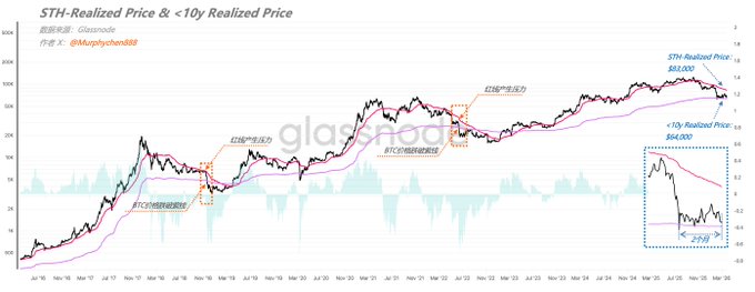 It’s time to test our judgment—there’s no precedent for this in the past decade, no guide to follow! From what I’ve observed, in the last 10 years, BTC has never seen such strong support right at the “<10y Realized Price (purple line)”—which is close to the real average cost basis—during any bear market. That’s right, it’s never happened before! Even now, with the NASDAQ down -10%, BTC has managed to stay above the <10y RP ($64,000) for two months straight. But if you look closely, there are some key differences compared to the previous two cycles. Back in 2018 and 2022, before BTC broke below the purple line, the price faced a critical test: could it break above the STH-RP (red line, short-term holder realized price)? When the price failed to break out and the red line kept pushing down, BTC eventually dropped below the purple line. But in Feb-Mar 2026, STH-RP hasn’t put any real pressure on BTC’s price—there’s still a decent gap ($83,000) even today. So what comes next? There are only two possible scenarios: 1. BTC stays above the purple line, and when the red line catches up, it breaks out upwards, flipping the trend. 2. If the red line keeps dropping and brings more pressure, short-term holders start capitulating near their cost basis, and BTC finally breaks below the purple line. Version 1 = Bear market is over. Version 2 = We’re heading into deep bear territory, and there’s no quick exit. If you ask me which scenario is more likely, I personally lean towards the latter—even though emotionally, I wish it were the former! twitter.com/Murphychen888/stat...