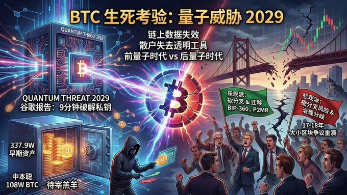Will 2029 be a life-or-death test for Bitcoin? Yesterday, Google's article caused a major stir in the Bitcoin community. It shattered the illusion that the "quantum threat is still far off," bringing forward the anticipated 10-20 year window to 2029 (after the 2028 Bitcoin halving). Google pointed out that a sufficiently powerful quantum computer can derive a private key from a public key in 9 minutes. Since the average Bitcoin block time is 10 minutes, this means attackers could intercept and forge transactions during the window before they are confirmed. Furthermore, a fatal flaw lies in the addresses whose public keys were exposed on-chain early on. On-chain data shows that there are currently 3.379 million Bitcoins held inactive for 10 years (of which 1.08 million are held by Satoshi Nakamoto's address). Theoretically, these coins could all be "lambs to the slaughter." Because these are mostly early holdings that have either "lost their coins" or "lost their owners," they cannot actively undergo "quantum migration resistance." If this system falls into the hands of the first hacker to break it, it means that in the world of Bitcoin, a "madman" possesses a massive amount of illicit wealth, 2.6 times that of ETFs and 4.4 times that of MSTRs. Currently, I see the community's reaction is mainly divided into two camps: Optimists believe that security can be ensured simply by introducing a quantum-resistant signature scheme (BIP-360 and P2MR) through a soft fork and completing the migration of Bitcoin wallets before the quantum threat arrives. Pessimists believe that even if it is technically feasible, a decentralized governance model is unlikely to reach a consensus within just 3-4 years, especially regarding how to handle so many exposed public keys in Bitcoin. Mishandling this could trigger another hard fork. At that time, the "conservatives" who support protecting private assets and the "radicals" who support cybersecurity will once again be locked in fierce debate. Just like the serious disagreements between the Core development team and large miners on large and small blocks in 2017-2018, which ultimately led to a hard fork and almost caused Bitcoin to collapse. Furthermore, even if the community eventually reaches a consensus, one thing may still be unavoidable. This means that a large amount of BTC migration was passively generated for security upgrades. These non-economic on-chain activities severely pollute BTC's on-chain data. As a "global public ledger," facing a survival crisis, it had to sacrifice its transparency premium. This could lead to structural failures in the trading models we've built over the past decade based on "on-chain data analysis." For example, all data based on "holding time" would become completely distorted, and the underlying logic of profit/loss valuation models would collapse. Future on-chain analytics tools may have to divide BTC's history into a "pre-quantum era" and a "post-quantum era." Only institutions with top-tier data cleaning capabilities (I don't know if Glassnode can) will be able to extract the true trading intentions from the massive noise. When trading decisions revert to traditional methods, and people start relying on news, sentiment, or technical analysis again, retail investors will lose a transparent and effective technical tool that offered them the "only chance to stand on the same starting line as institutions." This is indeed a great pity... research.google/blog/safeguard...…
