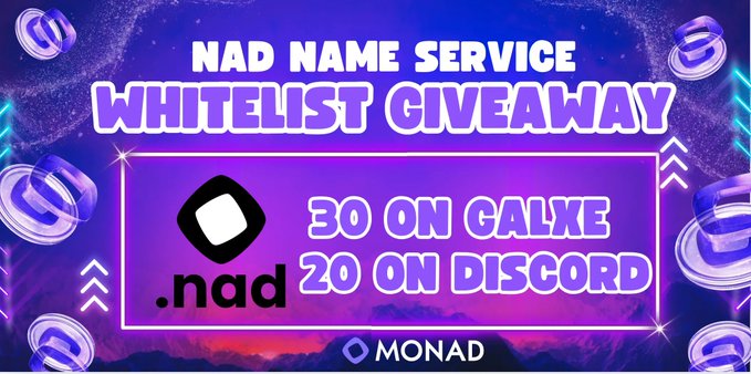 MONAD TESTNET - 50 Whitelists from @NadDomains 30 Whitelists on Galxe app.galxe.com/quest/NFTFeed/GC...… 20 Whitelists on Discord discord.gg/SaemCYwCzV Nad Name Service - The only native domain service, built on Monad. http:/app.nad.domains WL could get early mint rights on