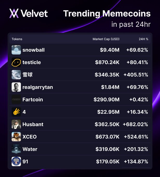 Top-10 trending memecoins on @Velvet_Capital $snowball crossed $10M mark 2-nd place is $testicles and $realgarrytan is going so close twitter.com/zeuuss_01/status/2...