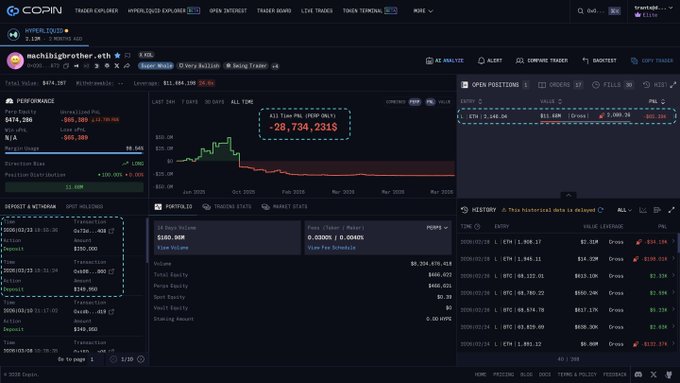 Everyone says @machibigbrother is down to his last dollars… not quite! He just deposited another $500K and opened a fresh $11.69M $ETH long (25x). Liquidation sits at $2,089. Despite losing $2.2M in the last 30 days, there’s zero sign of slowing down from the KOL trader 👀