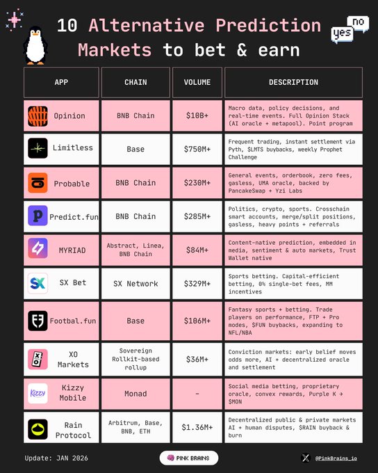 Prediction markets are everywhere now. But if you're too bored with Polymarket and Kalshi, here are 10 alternatives where you can bet and potentially earn airdrops or rewards 👇🧠