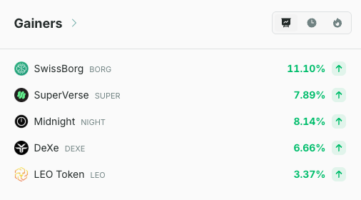 Today's top #crypto performers: 🔷 $BORG (+11%) 🔷 $SUPER (+8%) 🔷 $NIGHT (+8%) 🔷 $DEXE (+7%) 🔷 $LEO (+3%)